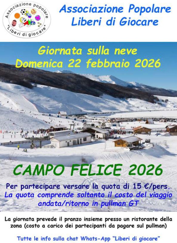 La giornata sulla neve inizia molto presto, con ritrovo alle ore 7,30 per la partenza con pullman GT tutti insieme. L'arrivo alle piste di Campo Felice avviene intorno alle 9,30. Sul posto ognuno è libero di svolgere l'attività che preferisce, da solo o in gruppo, fino alle ore 12,30 quando ci si ritrova ai pullman per andare al ristorante. Intorno alle 13,30 si svolge il PRANZO tutti insieme in un'armonia di festa e condivisione. Verso le 17,00 si riparte per rientrare a Roma.